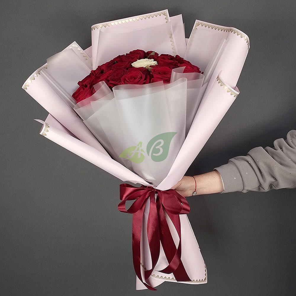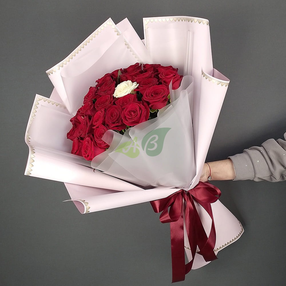 Не знаете какие розы подарить: красные или белые? Выбирайте контрастное сочетание двух цветов в букете из 25 штук. Идеально ровные стебли шикарных роз перетянуты лентой, чтобы букет держал форму и не распадался в вазе.